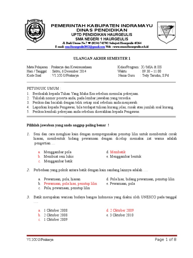 Buku pegangan guru prakarya kewirausahaan k13 kelas xii semester 1 2 rev 2018 pendidikan buku hobi koleksi bukalapak com inkuiri com. Oiya aktivitas prakarya tersebut juga bisa menyeimbangkan otak kanan serta otak kiri. Nah, ini ada satu lagi buat guru pkwu atau prakarya dan kewirausahaan yang malas bikin soal ujian akhir semester ganjil atau genap, silahkan unduh 30 soal pilihan ganda dan essay untuk uas semester ganjil sma kurikulum 2013. Berilah tanda silang (x) pada jawaban yang benar. Dibawah ini adalah hal yang diperlukan dalam mendirikan usaha, yaitu :