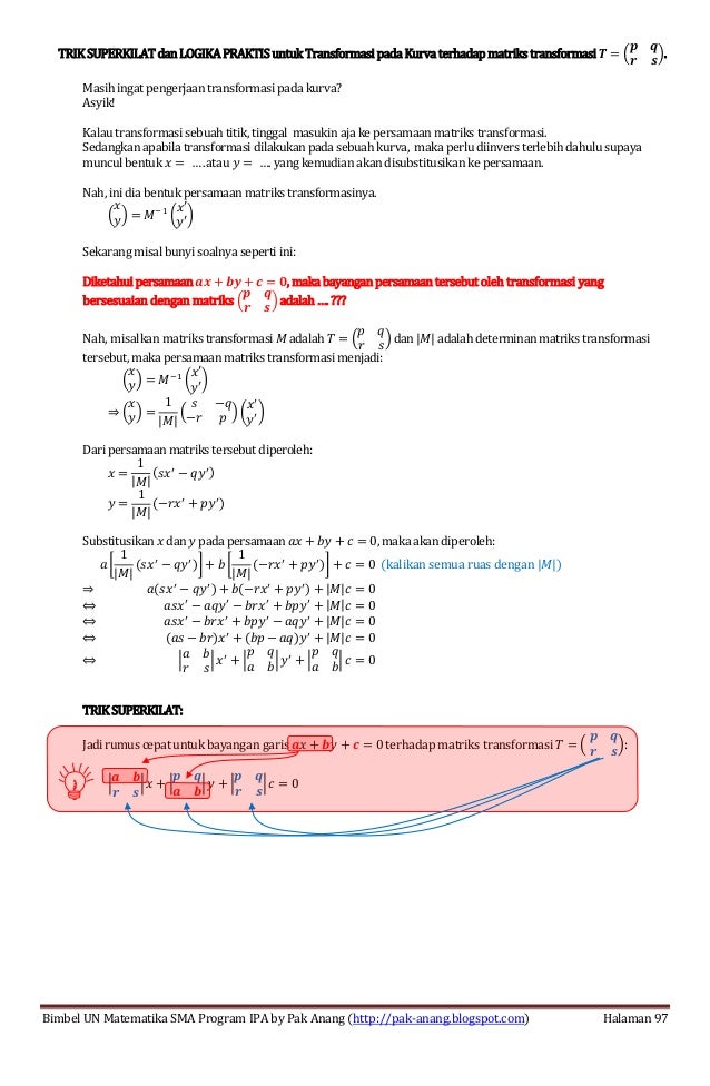Dari beberapa soal yang pernah keluar dalam ujian nasional matematika model soal transformasi geometri yang paling sering muncul adalah menentukan persamaan bayangan suatu parabola akibat rotasi menentukan koordinat bayangan titik akibat transformasi oleh matriks yang bersesuaian menentukan persamaan bayangan garis oleh transformasi matriks.