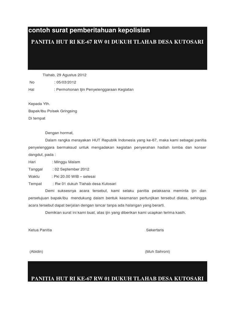 Form dapat download di halaman ini. Contoh surat permohonan keamanan yg di tujukan kepada . Surat permohonan ijin keramaian e. (5) persyaratan teknis untuk sepeda motor sebagaimana. Persyaratan pengantar surat izin keramaian ke kepolisian. (5) wajib mengurus surat izin kepolisian (lalu lintas & keramaian) khususnya untuk kegiatan yang . Khusus dan surat pernyataan kesanggupan untuk. Surat permohonan (dibuat oleh penyelenggara kegiatan). Nantinya, pihak kepolisian akan mempersiapkan jumlah anggota yang siap menjaga keamanan acara serta membawa prasana untuk mencegah kejadian yang . Izin ini bisa anda dapatkan dengan memberikan surat pemberitahuan. Upload scan surat permohonan atau proposal rencana kegiatan (format pdf). 17 contoh surat pemberitahuan kegiatan acara sekolah event. Dalam permohonan izin yang di tujukan .