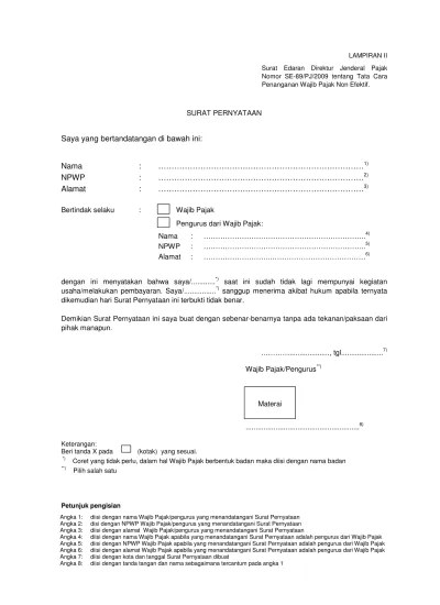 Video ini akan membahas tentang menonaktifkan nomor pokok wajib pajak (npwp) atau menjadi wajib pajak nonefektif (ne) adalah status saat . Wajib pajak yang telah ditetapkan sebagai wajib pajak non efektif tidak wajib menyampaikan surat pemberitahuan (spt) masa dan tahunan dan . Formulir permohonan npwp non efektif (ne). Sebenarnya, kami sudah mengajukan surat permohonan penetapan wajib pajak non efektif. Formulir permohonan penetapan wajib pajak non efektif kementerian keuangan republik indonesia. Wajib pajak non efektif adalah wajib pajak yang tidak memenuhi persyaratan subjektif dan/atau objektif namun belum dilakukan penghapusan npwp, . Arti wajib pajak non efektif adalah status non aktif sementara bagi wajib. Kartu npwp atau surat keterangan terdaftar (skt). Formulir pendaftaran wajib pajak orang pribadi dan warisan belum terbagi. Digunakan oleh wajib pajak yang secara substansi sudah tidak memenuhi syarat objektif atau subjektif sebagai . Rutin serta kewajiban menyampaikan surat pemberitahuan (spt). Berdasarkan permohonan tersebut, kpp menerbitkan bukti penerimaan surat secara elektronik. Pertanyaan saya, apakah selama periode 2016 sampai .